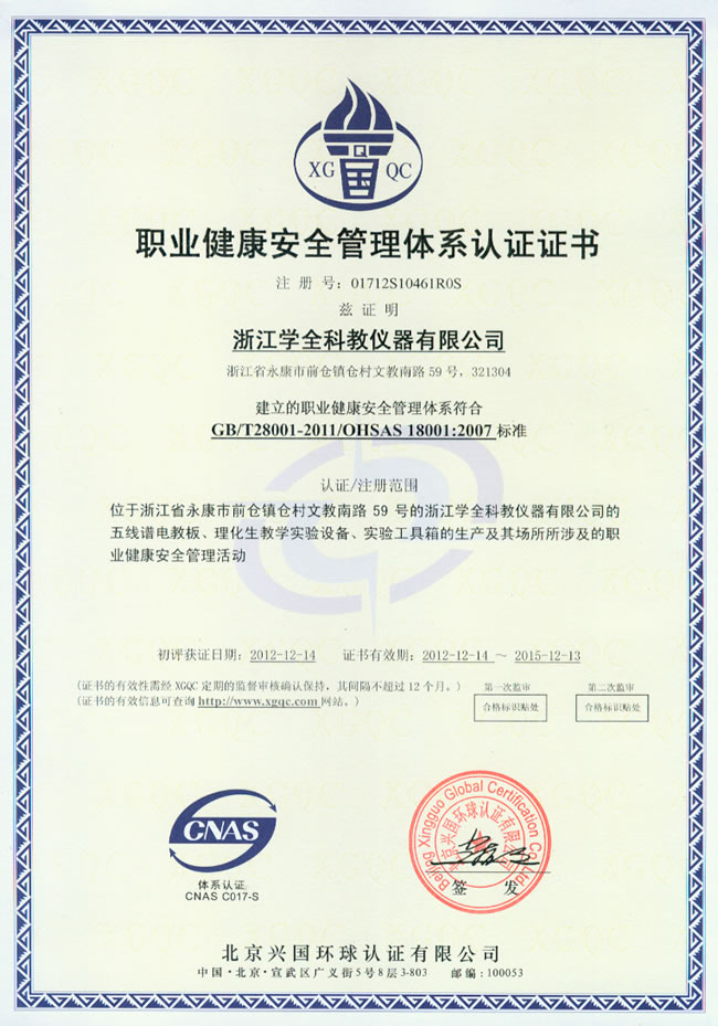 職業(yè)健康安全管理體系認(rèn)證證書(shū)